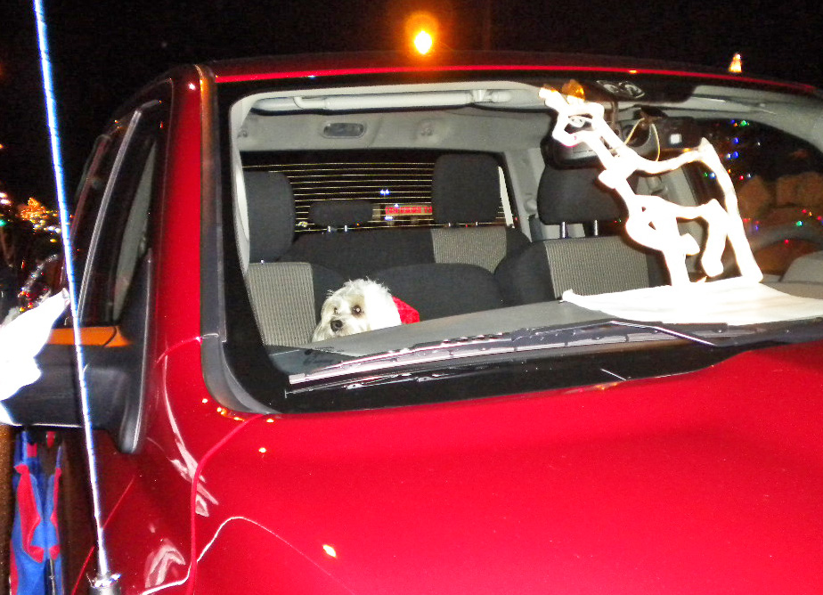 We had a member’s van for carrying dogs and people and borrowed a beautiful brand new 2011 Ram truck from Elgin Chrysler. We decorated both with lights and tinsel. My contribution to the decorating was figuring out how to tie a lighted reindeer to the rear view mirror of the Ram so he shone out from the windshield.