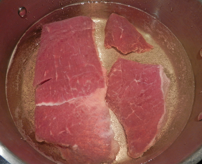 Rinse beef and put in a large pot. (Leave the fat on. It will largely cook away.) Cover with water or water and beer. Recipes called for a bottle of dark beer. I used Alpine lager.