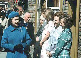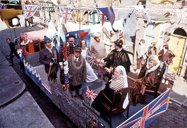 Real-life royal events have been celebrated in the storylines of Coronation Street. The wedding of William and Kate in 2011 caused Mary Taylor to opine on royal marriage patterns. On the Queen’s 60th Jubilee, Coronation Street had a huge street party with everyone dressed up as a rock star. The Golden Jubilee in 2002 was marked with Roy’s attempt to reenact the Civil War on the Red Rec. For 1977’s Silver Jubilee, a street party with the theme of England through the ages. Ena Sharpes was Queen Victoria and Annie Walker was Elizabeth I. Of course.